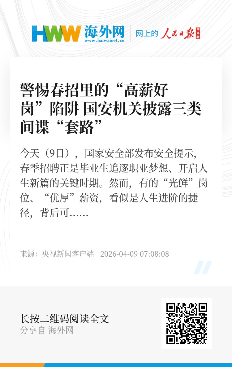 今天(9日),国家安全部发布安全提示,春季招聘正是毕业生追逐职业梦想、开启人生新篇的关键时期。然而,有的“光鲜”岗位、“优厚”薪资,看似是人生进阶的捷径,背后可能隐藏着境外间谍情报机关精心布下的陷阱。提醒广大毕业生在求职路上要识破这些别有用心的“套路”,守护个人前程与国家安全。