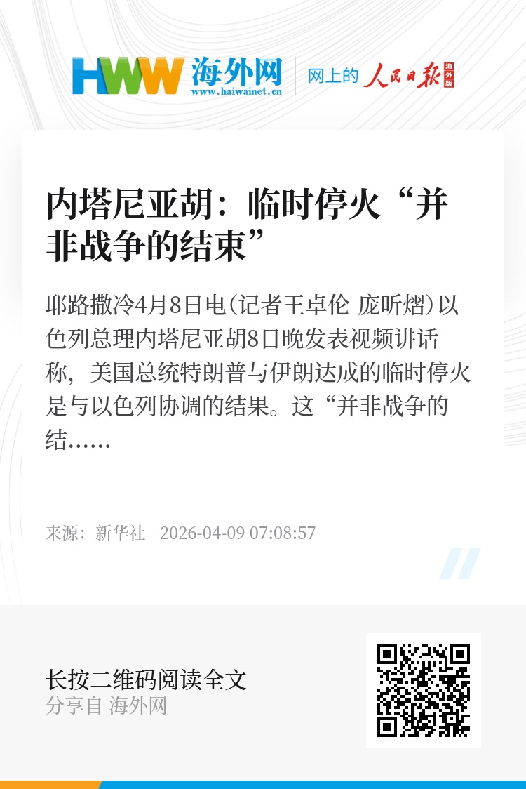 新华社耶路撒冷4月8日电(记者王卓伦 庞昕熠)以色列总理内塔尼亚胡8日晚发表视频讲话称,美国总统特朗普与伊朗达成的临时停火是与以色列协调的结果。这“并非战争的结束”,而是以方所有既定目标实现过程中的一个阶段。