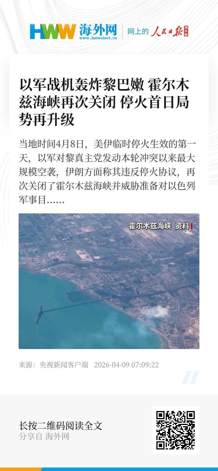 当地时间4月8日,美伊临时停火生效的第一天,以军对黎真主党发动本轮冲突以来最大规模空袭,伊朗方面称其违反停火协议,再次关闭了霍尔木兹海峡并威胁准备对以色列军事目标采取威慑行动。