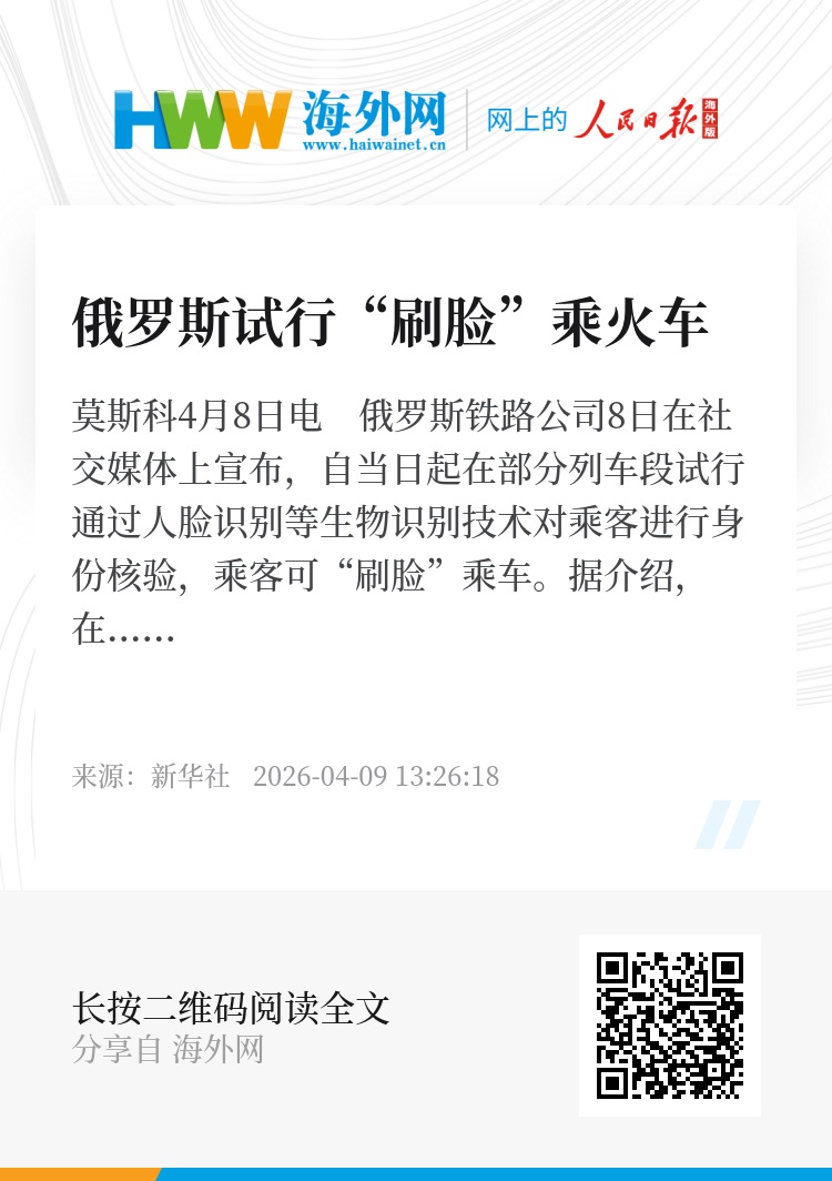 新华社莫斯科4月8日电 俄罗斯铁路公司8日在社交媒体上宣布,自当日起在部分列车段试行通过人脸识别等生物识别技术对乘客进行身份核验,乘客可“刷脸”乘车。
