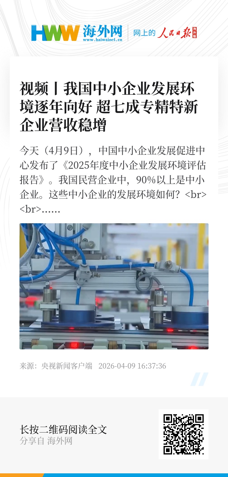 今天(4月9日),中国中小企业发展促进中心发布了《2025年度中小企业发展环境评估报告》。我国民营企业中,90%以上是中小企业。这些中小企业的发展环境如何?