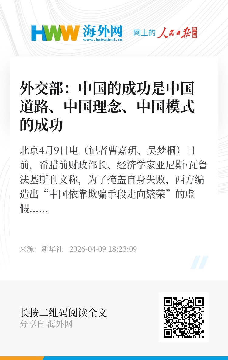 新华社北京4月9日电(记者曹嘉玥、吴梦桐)日前,希腊前财政部长、经济学家亚尼斯·瓦鲁法基斯刊文称,为了掩盖自身失败,西方编造出“中国依靠欺骗手段走向繁荣”的虚假叙事,应以更客观的视角看待中国经济成功的原因。外交部发言人毛宁9日就此表示,中国的成功不是偶然,而是中国制度优势的体现,是中国道路、中国理念、中国模式的成功。