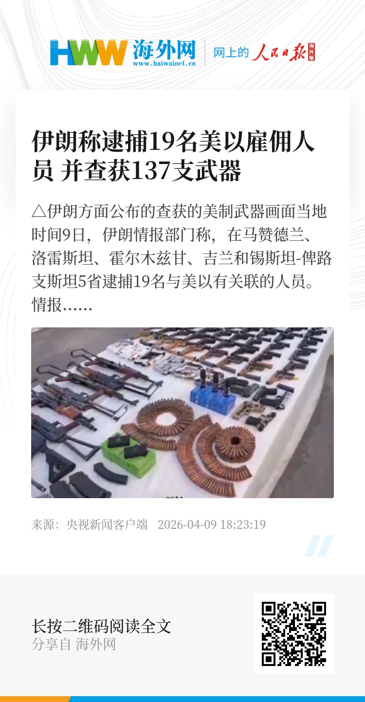 当地时间9日,伊朗情报部门称,在马赞德兰、洛雷斯坦、霍尔木兹甘、吉兰和锡斯坦-俾路支斯坦5省逮捕19名与美以有关联的人员。情报部门还表示,上述人员计划对安全机构实施恐怖袭击,并向以色列提供敏感信息。此外,在当天的行动中还查获137支各类武器,其中大部分为美国制造。(总台记者 李健南 江浩宇)