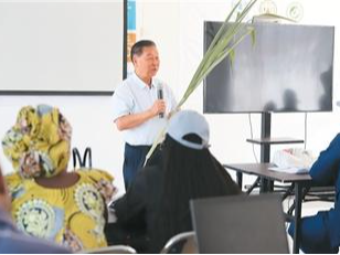 在位于卢旺达南方省胡耶区的中国援卢农业技术示范中心,林占熺为培训班学员讲解菌草技术。
