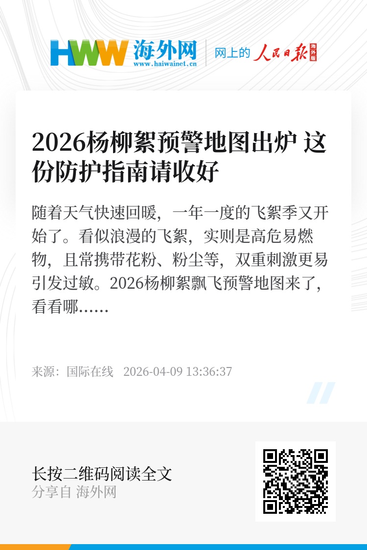 随着天气快速回暖,一年一度的飞絮季又开始了。看似浪漫的飞絮,实则是高危易燃物,且常携带花粉、粉尘等,双重刺激更易引发过敏。2026杨柳絮飘飞预警地图来了,看看哪些地方即将进入飞絮期,还有关于杨柳絮的冷知识及防飞絮口诀,助你全方位应对春日烦恼。