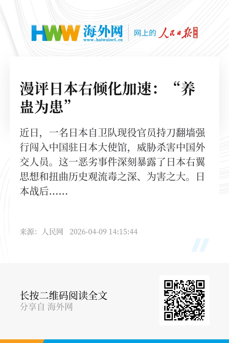 近日,一名日本自卫队现役官员持刀翻墙强行闯入中国驻日本大使馆,威胁杀害中国外交人员。这一恶劣事件深刻暴露了日本右翼思想和扭曲历史观流毒之深、为害之大。