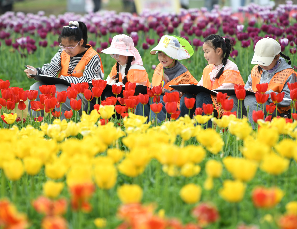4月1日,在安徽巢湖经济开发区半汤郁金香高地,小朋友参加春假写生活动。新华社发(马丰成摄)