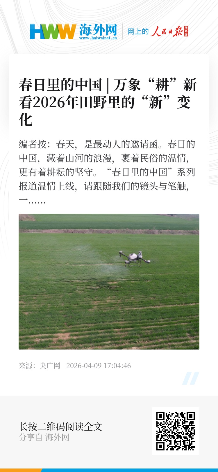 央广网北京4月8日消息(记者温雅慧)春风拂过黑土地,细雨润泽江南岸。2026年的春天,一场以“新”为底色的春耕画卷,正由南向北渐次展开。
