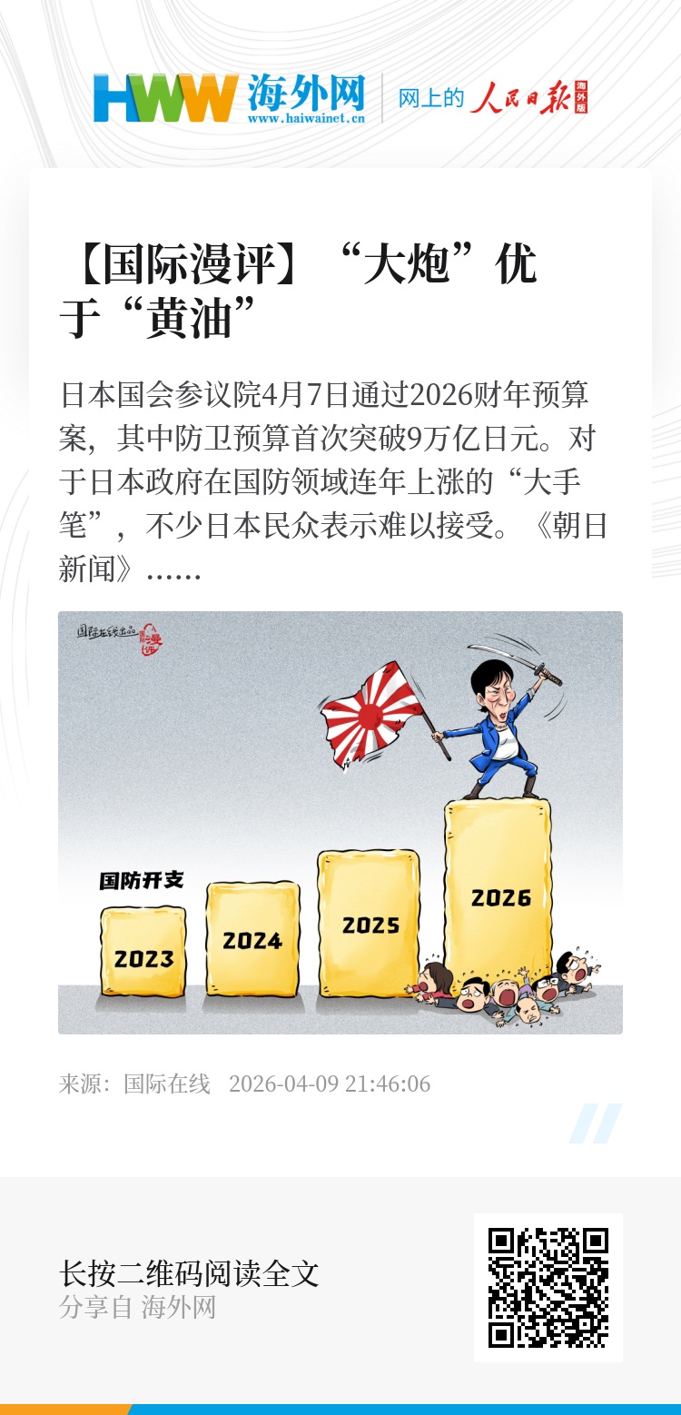 日本国会参议院4月7日通过2026财年预算案,其中防卫预算首次突破9万亿日元。对于日本政府在国防领域连年上涨的“大手笔”,不少日本民众表示难以接受。《朝日新闻》评论称:“在高市政府眼中,‘大炮’的优先级显然高于‘黄油’。当民众因加薪赶不上通胀而陷入困境时,政府却在为昂贵的导弹买单。”