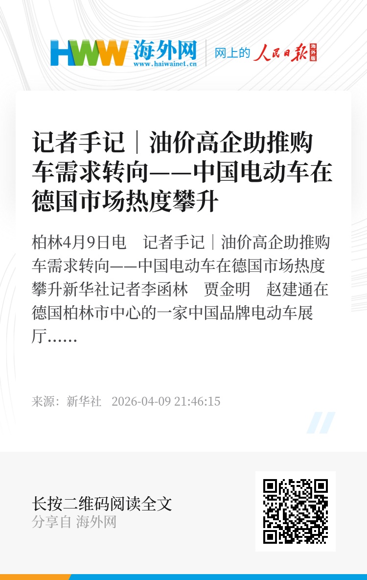 新华社柏林4月9日电 记者手记|油价高企助推购车需求转向——中国电动车在德国市场热度攀升