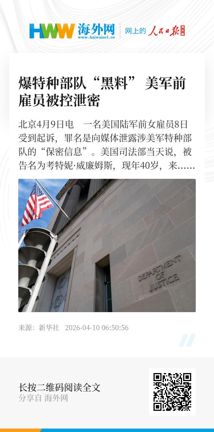 新华社北京4月9日电 一名美国陆军前女雇员8日受到起诉,罪名是向媒体泄露涉美军特种部队的“保密信息”。