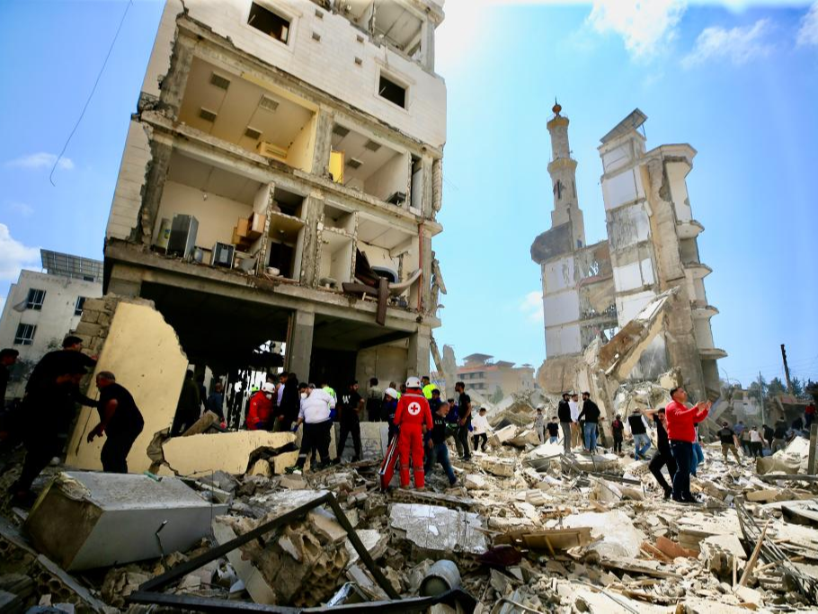 4月8日,在黎巴嫩南部西顿市,救援人员在以军空袭损毁的建筑废墟中寻找生还者。新华社发(阿里·哈希绍摄)