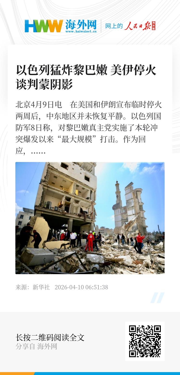 新华社北京4月9日电 在美国和伊朗宣布临时停火两周后,中东地区并未恢复平静。以色列国防军8日称,对黎巴嫩真主党实施了本轮冲突爆发以来“最大规模”打击。作为回应,伊朗叫停了霍尔木兹海峡的油轮通行。美伊之间仍存在严重分歧,停火谈判的前景并不明朗。