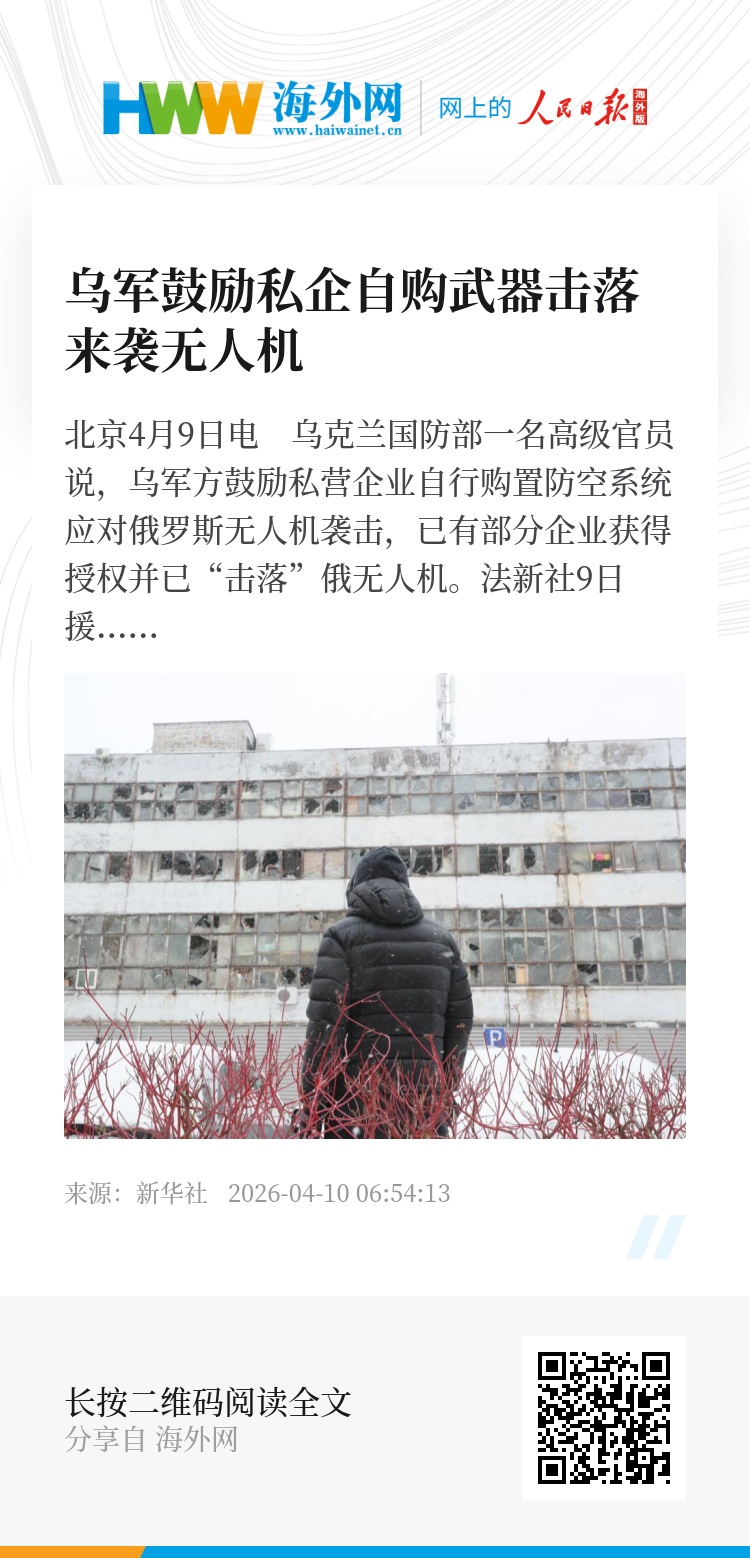 新华社北京4月9日电 乌克兰国防部一名高级官员说,乌军方鼓励私营企业自行购置防空系统应对俄罗斯无人机袭击,已有部分企业获得授权并已“击落”俄无人机。