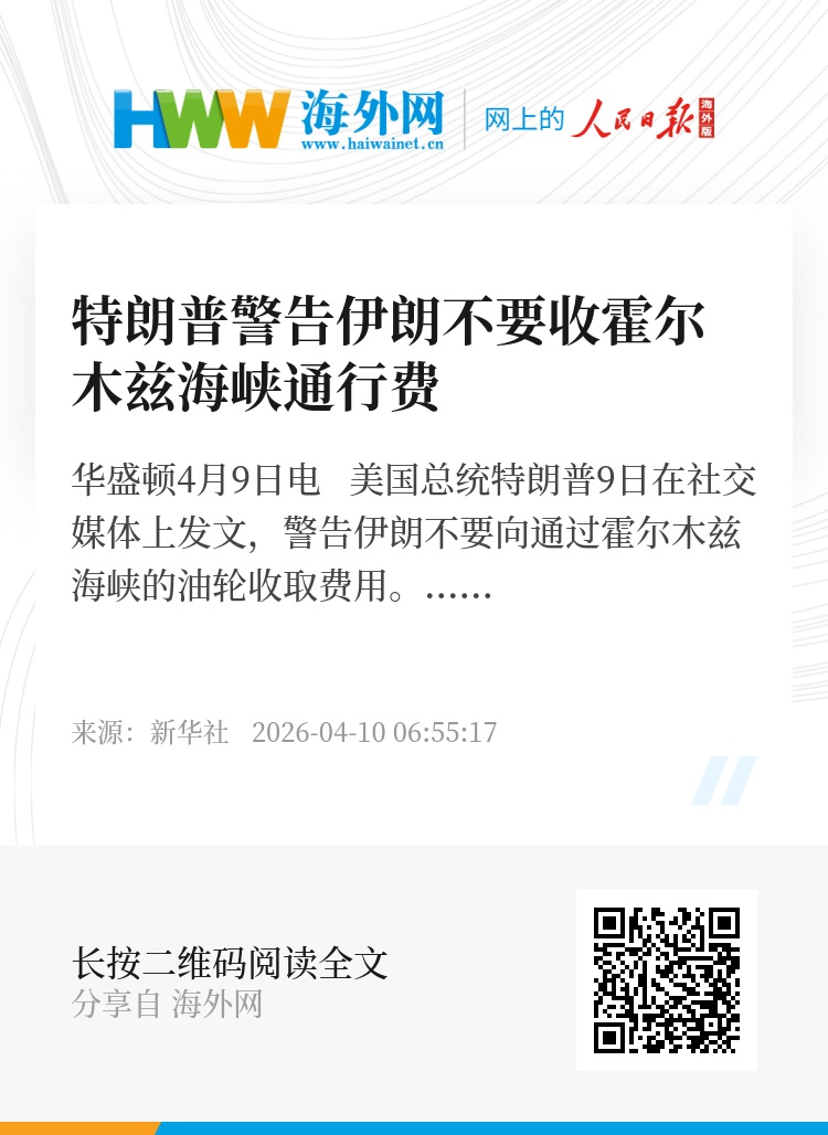 新华社华盛顿4月9日电 美国总统特朗普9日在社交媒体上发文,警告伊朗不要向通过霍尔木兹海峡的油轮收取费用。