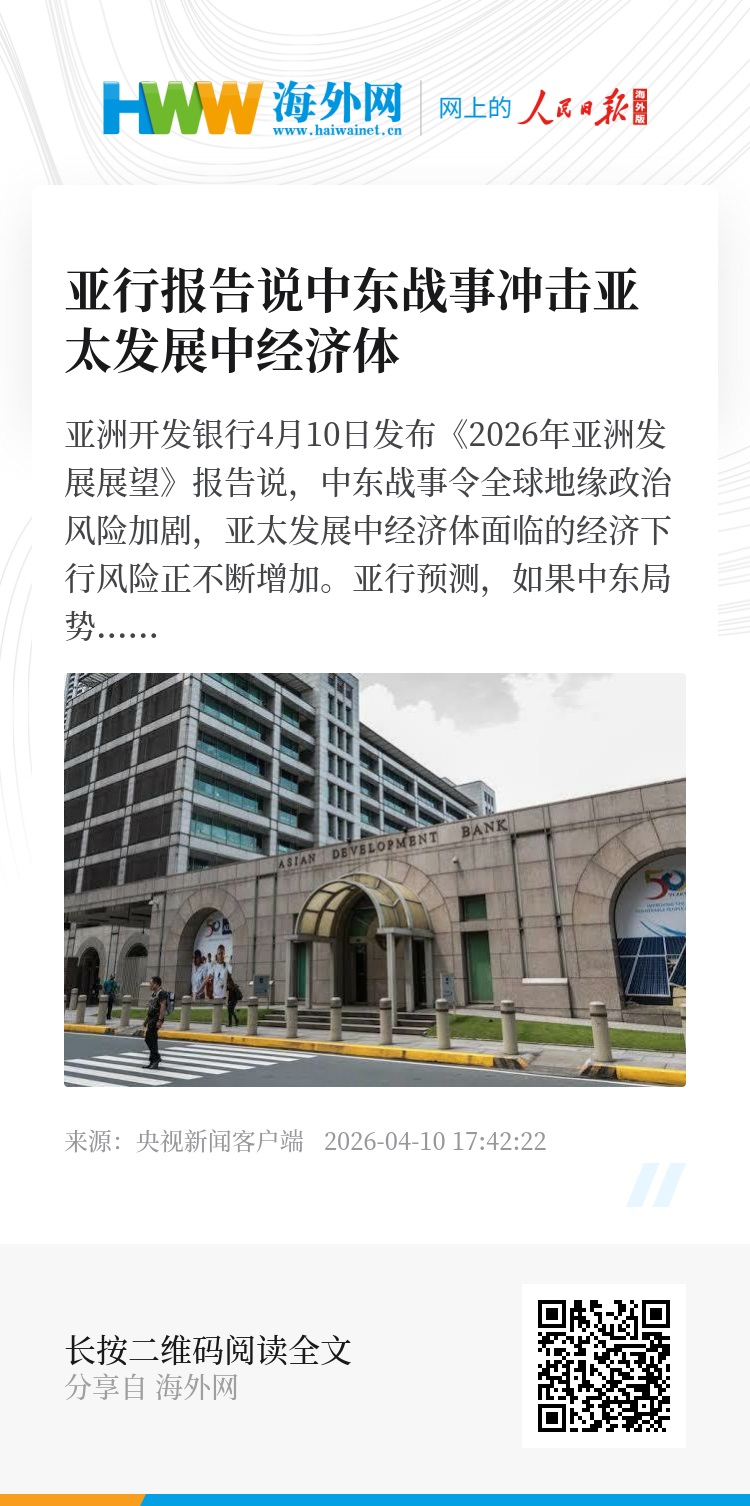 亚洲开发银行4月10日发布《2026年亚洲发展展望》报告说,中东战事令全球地缘政治风险加剧,亚太发展中经济体面临的经济下行风险正不断增加。