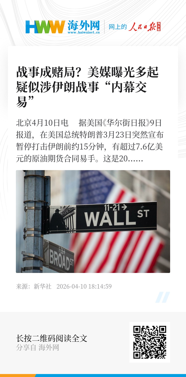 新华社北京4月10日电 据美国《华尔街日报》9日报道,在美国总统特朗普3月23日突然宣布暂停打击伊朗前约15分钟,有超过7.6亿美元的原油期货合同易手。