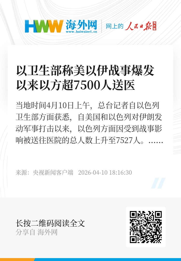 当地时间4月10日上午,总台记者自以色列卫生部方面获悉,自美国和以色列对伊朗发动军事打击以来,以色列方面因受到战事影响被送往医院的总人数上升至7527人。