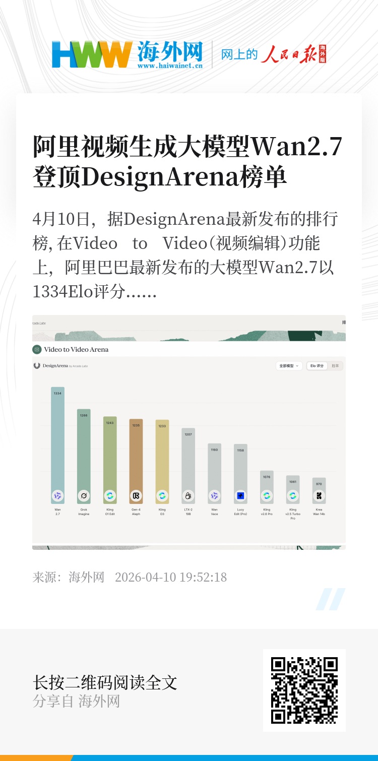 4月10日,据DesignArena最新发布的排行榜,在Video to Video(视频编辑)功能上,阿里巴巴最新发布的大模型Wan2.7以1334Elo评分高居榜首,大幅领先第二名Grok Imagine(1266分),优势达68分。DesignArena 是全球首个众包评测AI生成设计的基准平台,由全球用户投票产生排行榜。