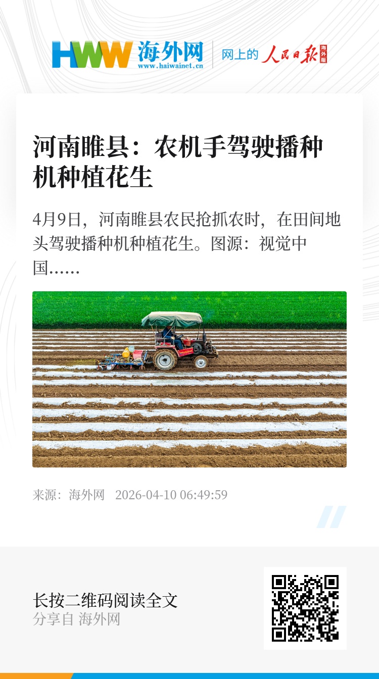 4月9日,河南睢县农民抢抓农时,在田间地头驾驶播种机种植花生。图源:视觉中国
