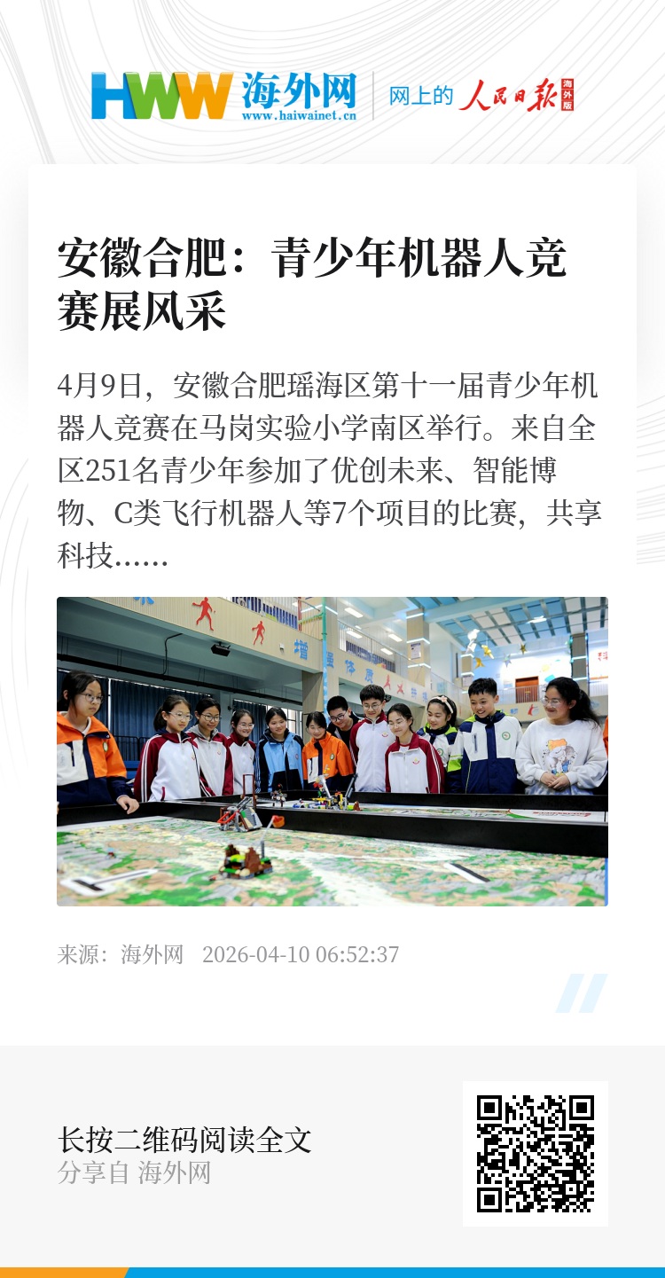 4月9日,安徽合肥瑶海区第十一届青少年机器人竞赛在马岗实验小学南区举行。来自全区251名青少年参加了优创未来、智能博物、C类飞行机器人等7个项目的比赛,共享科技魅力。图源:视觉中国