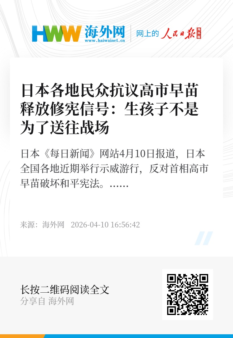 另据日本朝日电视台4月10日报道,9日上午,“反对修宪游行”话题位列社交媒体热搜榜首位,人们纷纷留言“为阻止修宪,这样的抗争非常重要”“希望媒体多报道”。日本相关市民社会团体预告,4月19日还将在国会议事堂前再次举办大规模反战和平集会活动。(海外网 王珊宁)