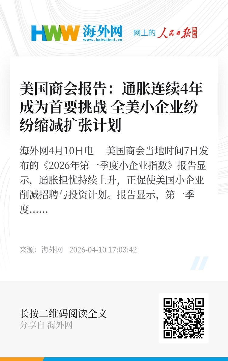 海外网4月10日电 美国商会当地时间7日发布的《2026年第一季度小企业指数》报告显示,通胀担忧持续上升,正促使美国小企业削减招聘与投资计划。
