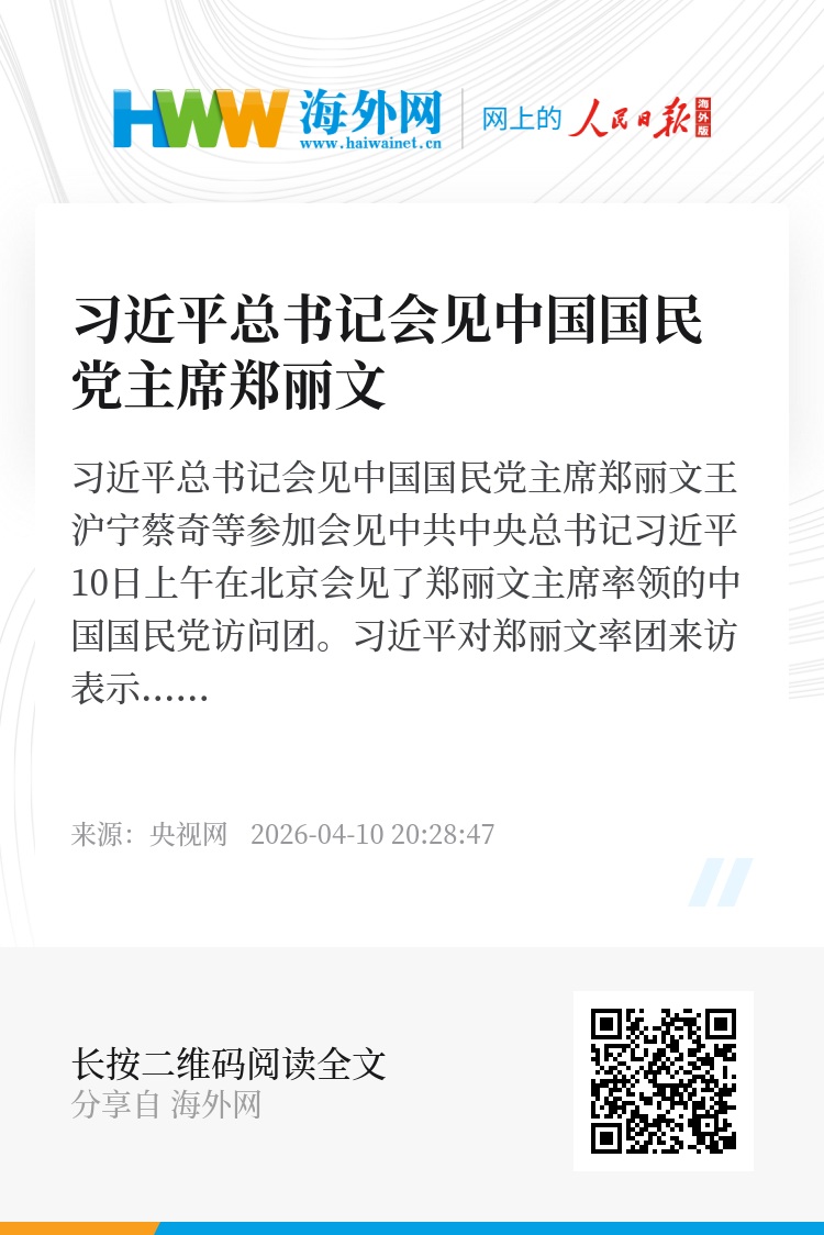习近平对郑丽文率团来访表示欢迎。他指出,国共两党领导人时隔10年再次会面,对两党关系、两岸关系发展具有重要意义。两岸同胞同属中华民族,包括台湾同胞在内的各族人民共同缔造了统一的多民族国家,共同书写了辉煌的中国历史,共同创造了灿烂的中华文明,共同培育了伟大的民族精神,也铸就了国土不可分、国家不可乱、民族不可散、文明不可断的共同信念,引领中华民族自强不息、中华文明绵延不断。