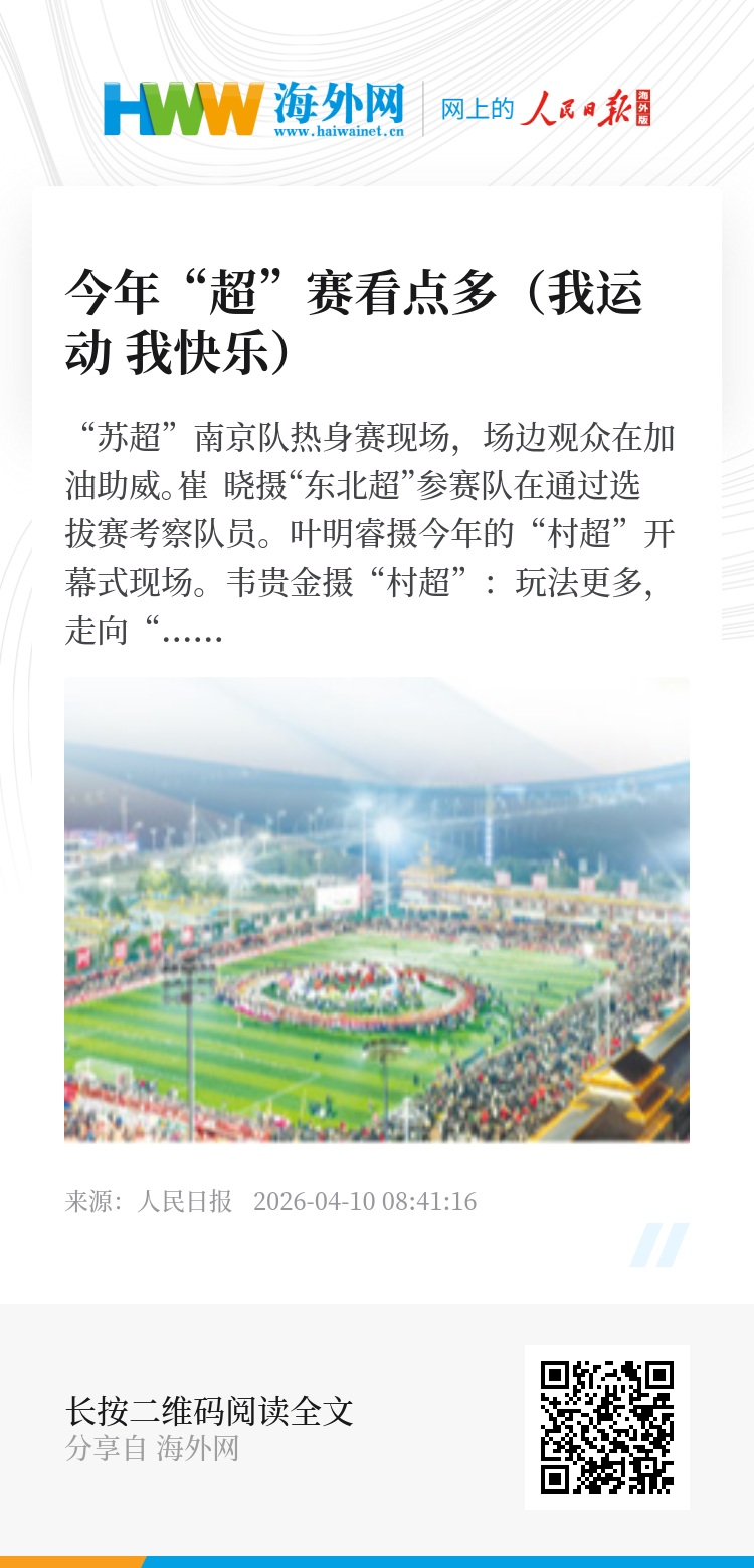 近年来,群众体育赛事活动遍地开花、热闹非凡。2024年,我国首次以“大区赛”形式举办全民健身大赛,6000余场赛事来到群众身边;2025年,第十五届全国运动会群众赛事活动累计举办预赛超6800场,“我要上全运”系列活动蓬勃开展,吸引约110万人次直接参与;“苏超”“湘超”“村排”“浙BA”等群众体育赛事在各地掀起热潮……我运动,我快乐,人们从“旁观者”变成“参与者”“组织者”,赛事活动激发城市乡镇活力,赋能地方经济社会发展。