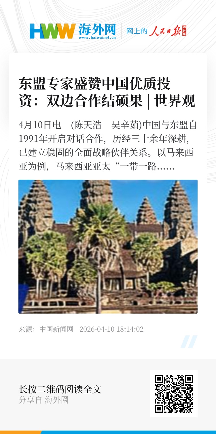 中新网4月10日电 (陈天浩 吴辛茹)中国与东盟自1991年开启对话合作,历经三十余年深耕,已建立稳固的全面战略伙伴关系。以马来西亚为例,马来西亚亚太“一带一路”共策会执行董事、拿督翁忠义(Ong Chong Yi)对中国新闻网表示,自2011年马中签署双方关于扩大和深化经济贸易合作的协定和2013年签署双边经贸合作五年规划以来,马来西亚迎来大量优质中方投资,助力基建升级、为多州青年毕业生创造充足就业岗位。柬埔寨金边皇家大学国际研究与公共管理学院院长尼克·尚达里斯(Neak Chandarith)则介绍,中国资助建设的柬埔寨金港高速公路以及“钻石六边”合作框架下规划的“工业发展走廊”将完善物流网络、显著缩短运输时间并降低成本,极大地推动柬埔寨融入准时制供应链。