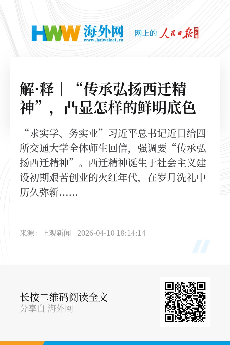 习近平总书记近日给四所交通大学全体师生回信,强调要“传承弘扬西迁精神”。西迁精神诞生于社会主义建设初期艰苦创业的火红年代,在岁月洗礼中历久弥新,是中国共产党人精神谱系中的重要组成部分。西迁精神的鲜明底色集中体现为“与国家民族休戚与共”的家国情怀、“打起背包就出发”的政治品格、“到祖国最需要的地方去”的使命担当。
