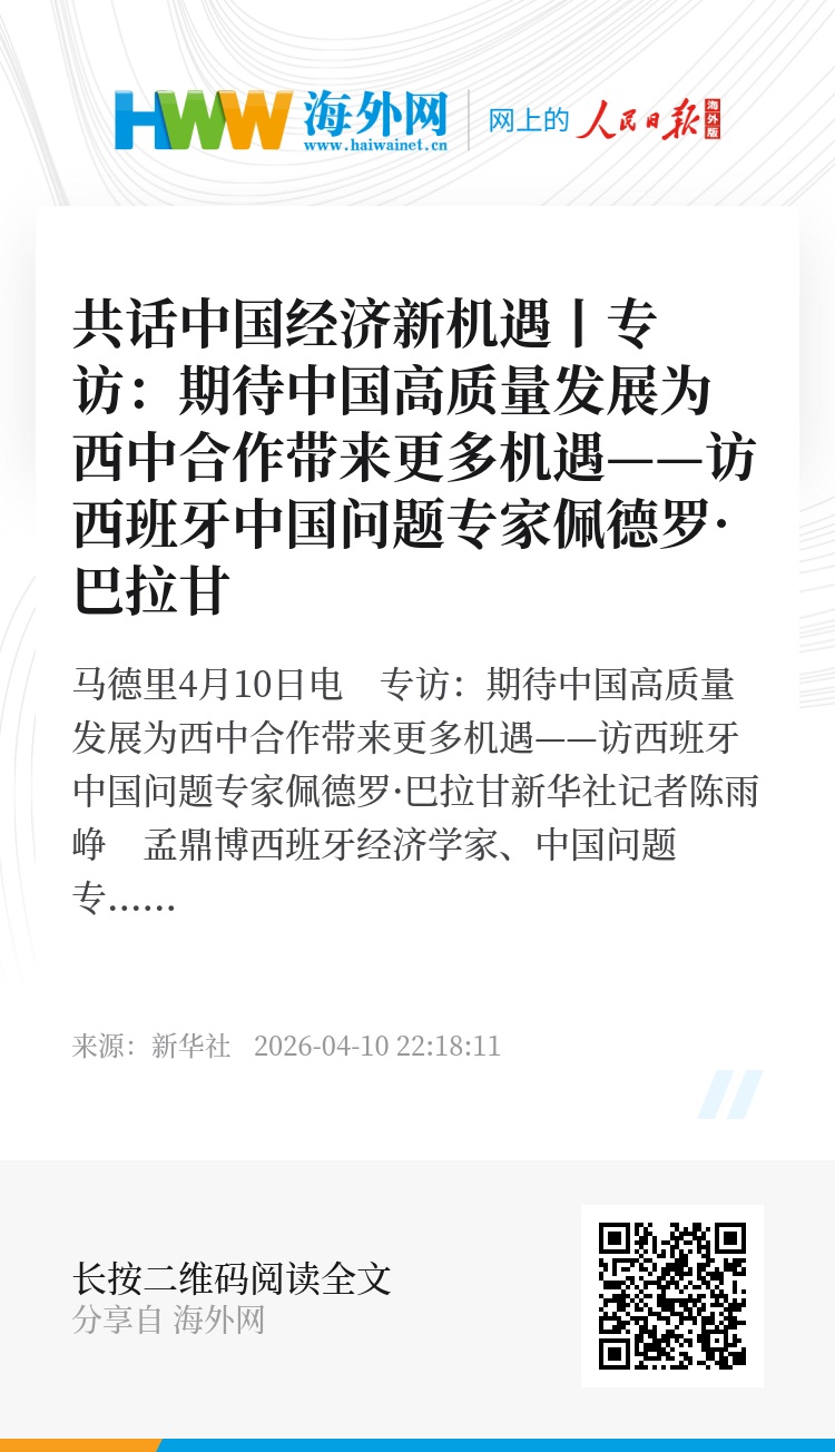 新华社马德里4月10日电 专访:期待中国高质量发展为西中合作带来更多机遇——访西班牙中国问题专家佩德罗·巴拉甘