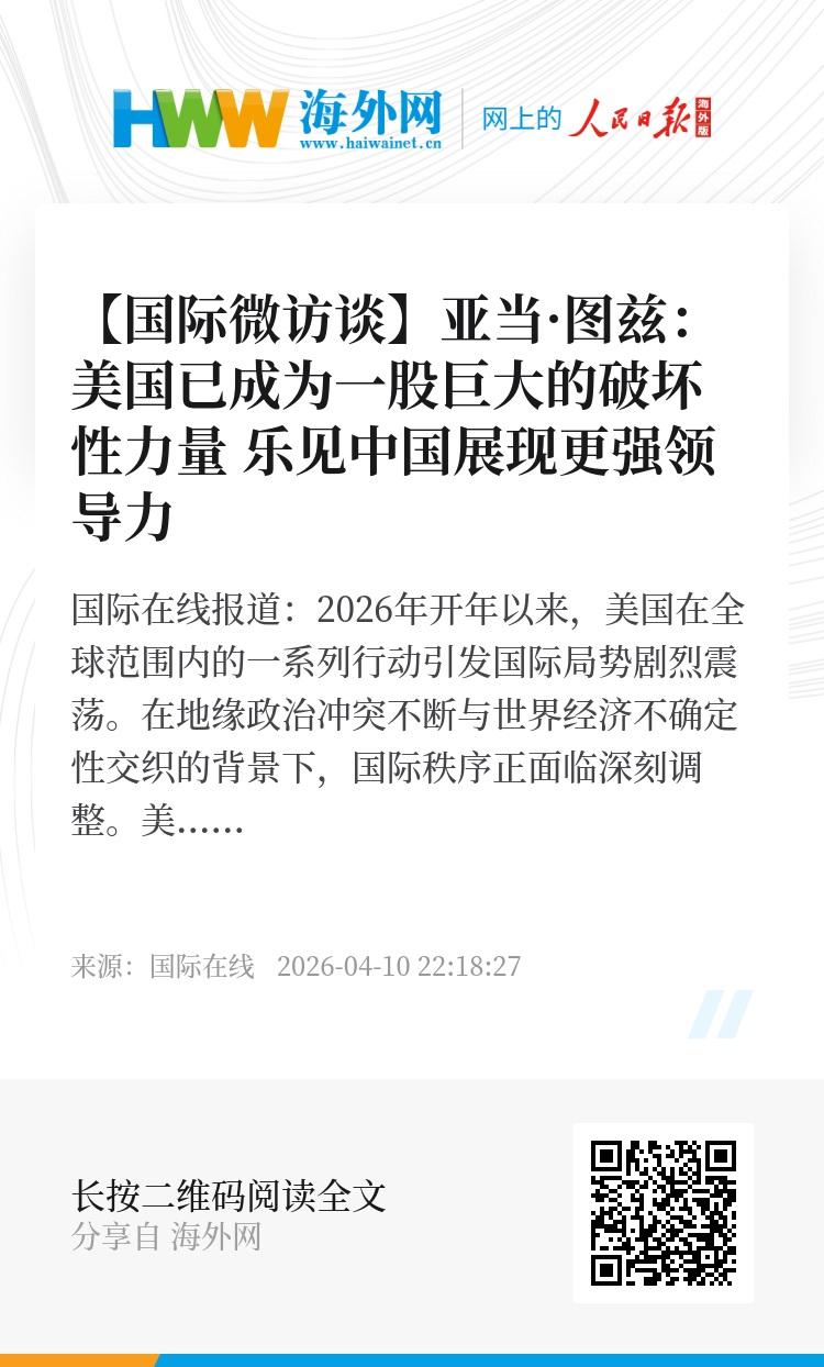 图兹指出,美国在全球事务中的政策连续性与可预期性下降,甚至给部分地区带来破坏性影响,但世界发展不会因此停摆。在他看来,与美国相反,中国正通过技术、贸易和市场提供更具普惠性的解决方案,在促进全球互联互通与绿色发展方面展现出领导力,并逐步成为全球标准制定的重要参与者。