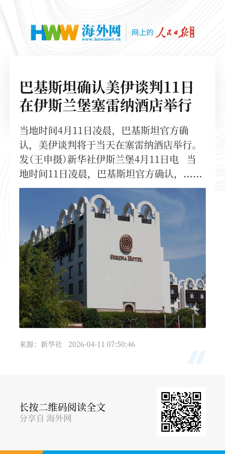 新华社伊斯兰堡4月11日电 当地时间11日凌晨,巴基斯坦官方确认,美伊谈判将于当天在巴首都伊斯兰堡的塞雷纳酒店举行。