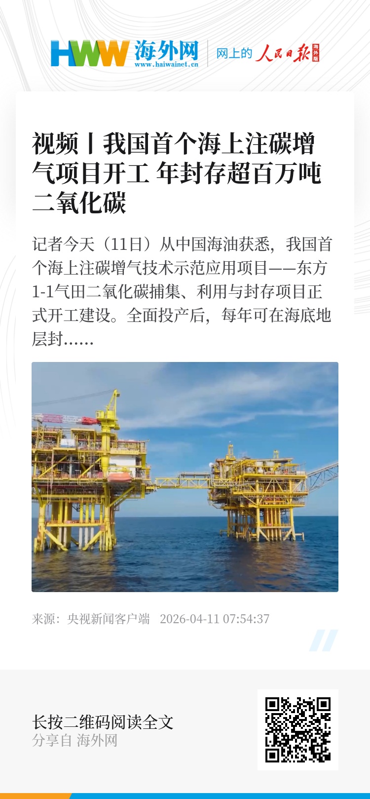 记者今天(11日)从中国海油获悉,我国首个海上注碳增气技术示范应用项目——东方1-1气田二氧化碳捕集、利用与封存项目正式开工建设。全面投产后,每年可在海底地层封存超百万吨二氧化碳。