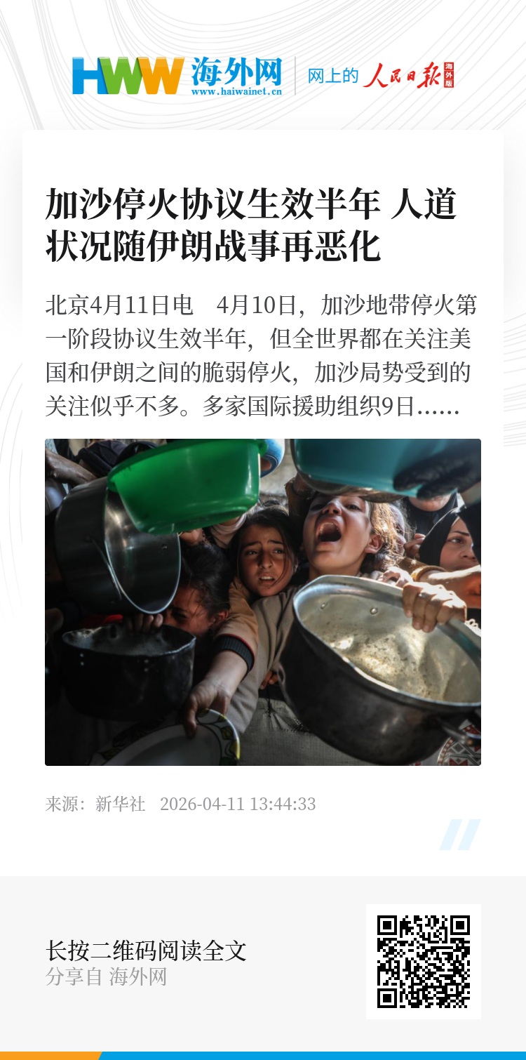 新华社北京4月11日电 4月10日,加沙地带停火第一阶段协议生效半年,但全世界都在关注美国和伊朗之间的脆弱停火,加沙局势受到的关注似乎不多。多家国际援助组织9日表示,2月28日美国和以色列对伊朗发起军事行动后,运入加沙的援助物资减少,当地生活必需品价格大涨,加沙地带人道主义状况进一步恶化。
