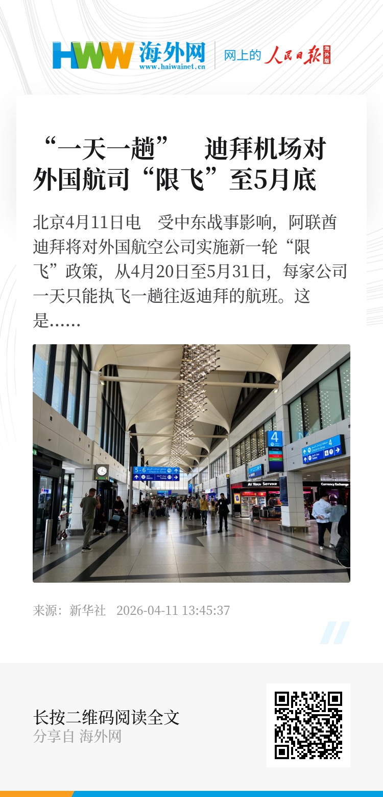 新华社北京4月11日电 受中东战事影响,阿联酋迪拜将对外国航空公司实施新一轮“限飞”政策,从4月20日至5月31日,每家公司一天只能执飞一趟往返迪拜的航班。