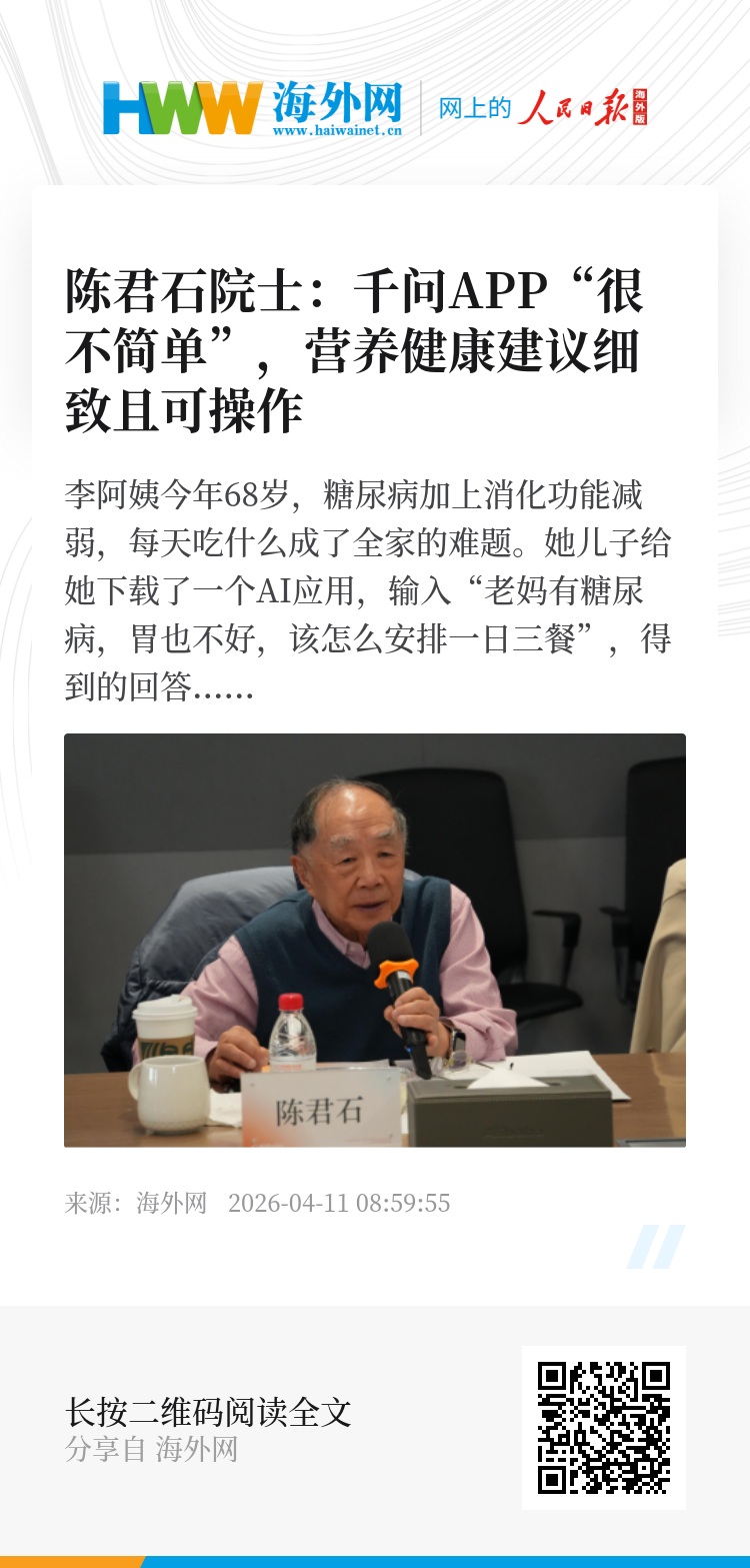 国家食品安全风险评估中心总顾问陈君石看了千问的回答后说了一句话:“很不简单。”