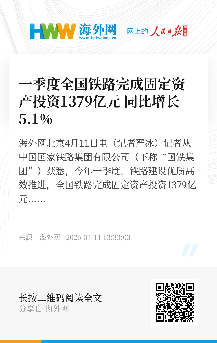 海外网北京4月11日电(记者严冰)记者从中国国家铁路集团有限公司(下称“国铁集团”)获悉,今年一季度,铁路建设优质高效推进,全国铁路完成固定资产投资1379亿元,同比增长5.1%,实现全年良好开局,为区域经济社会发展注入了新动能。