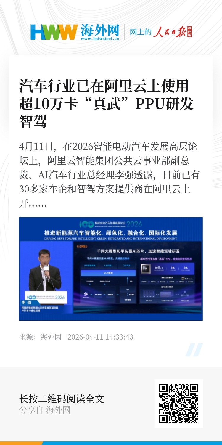 4月11日,在2026智能电动汽车发展高层论坛上,阿里云智能集团公共云事业部副总裁、AI汽车行业总经理李强透露,目前已有30多家车企和智驾方案提供商在阿里云上开展智驾研发,实际使用的平头哥自研"真武"PPU已突破10万卡,创下汽车行业在公共云平台上使用自研AI芯片的最大规模纪录。