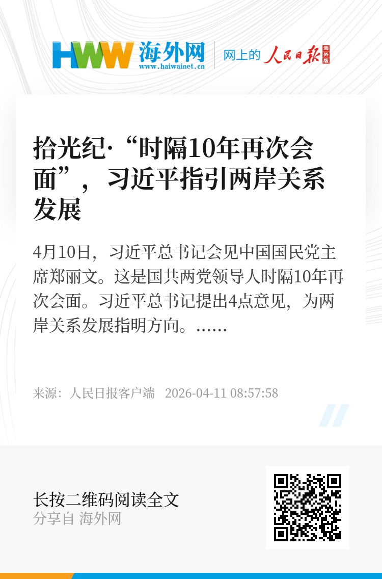 4月10日,习近平总书记会见中国国民党主席郑丽文。这是国共两党领导人时隔10年再次会面。习近平总书记提出4点意见,为两岸关系发展指明方向。