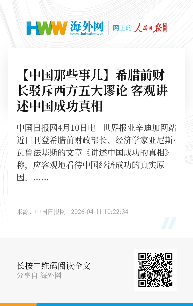 中国日报网4月10日电 世界报业辛迪加网站近日刊登希腊前财政部长、经济学家亚尼斯·瓦鲁法基斯的文章《讲述中国成功的真相》称,应客观地看待中国经济成功的真实原因,只有基于事实的对话,才能避免灾难性的“新冷战”升级。讲述中国成功的真相,不是为了美化任何一方,而是为了维护和平。