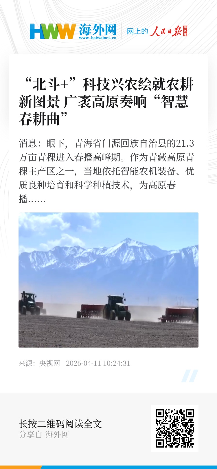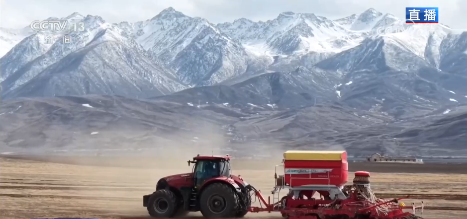 在青海省门源县的一处青稞种植基地,祁连山东段的达坂山雪峰清晰可见,这里的海拔在3000米以上,属高原冷凉气候;同时日照非常充足,是青藏高原青稞种植的黄金海拔带,也是青海省青稞种植的核心区之一。此刻,当地农户正抢抓高原春播的黄金窗口期,开展播种作业。