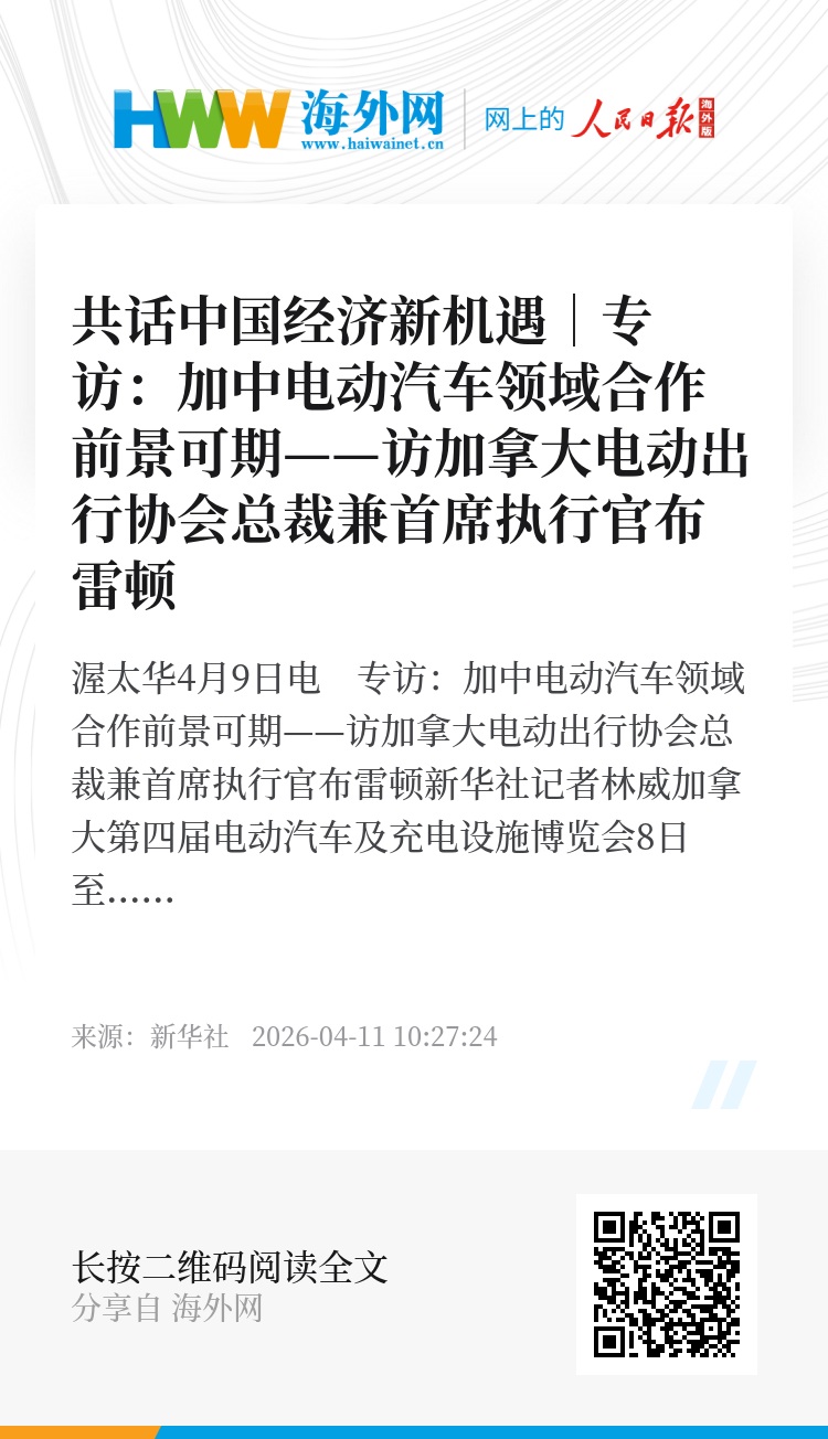 新华社渥太华4月9日电 专访:加中电动汽车领域合作前景可期——访加拿大电动出行协会总裁兼首席执行官布雷顿