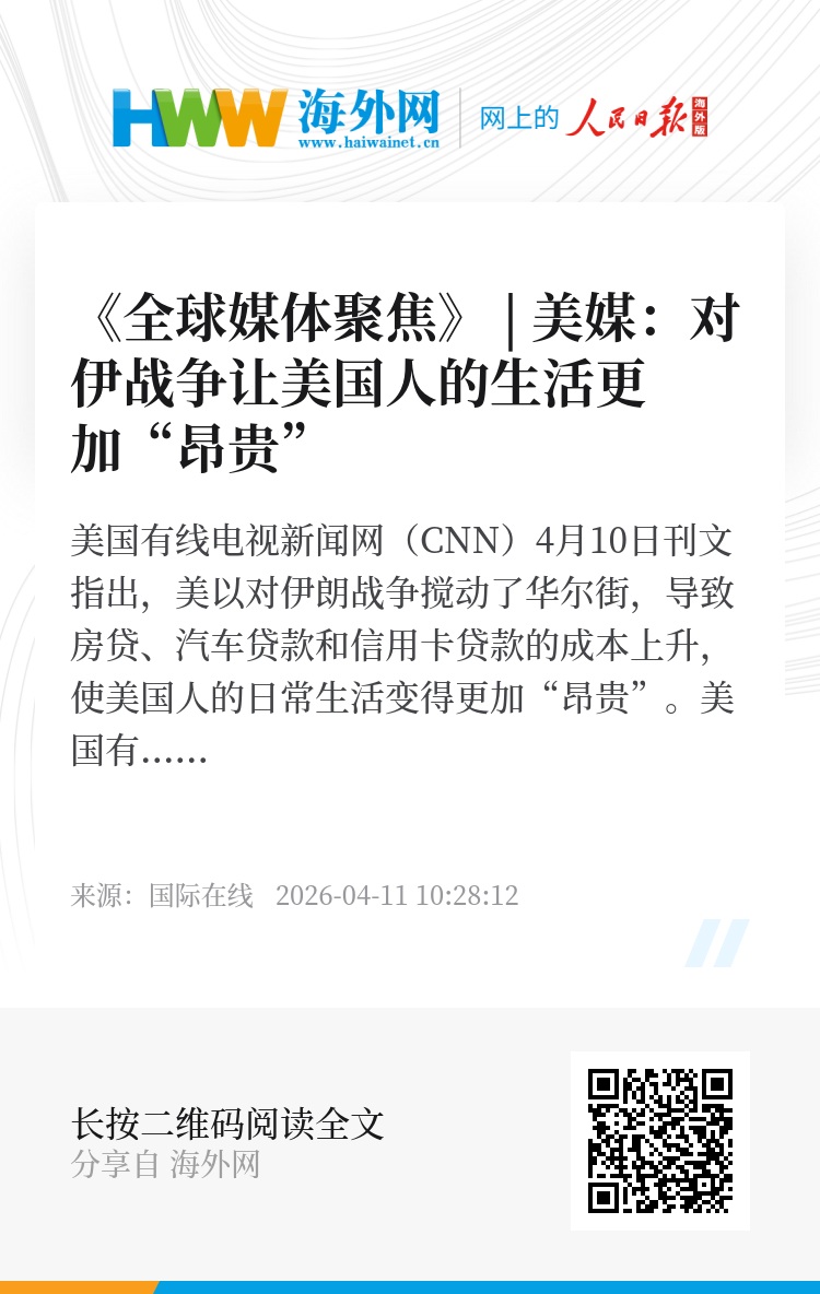 美国有线电视新闻网(CNN)4月10日刊文指出,美以对伊朗战争搅动了华尔街,导致房贷、汽车贷款和信用卡贷款的成本上升,使美国人的日常生活变得更加“昂贵”。
