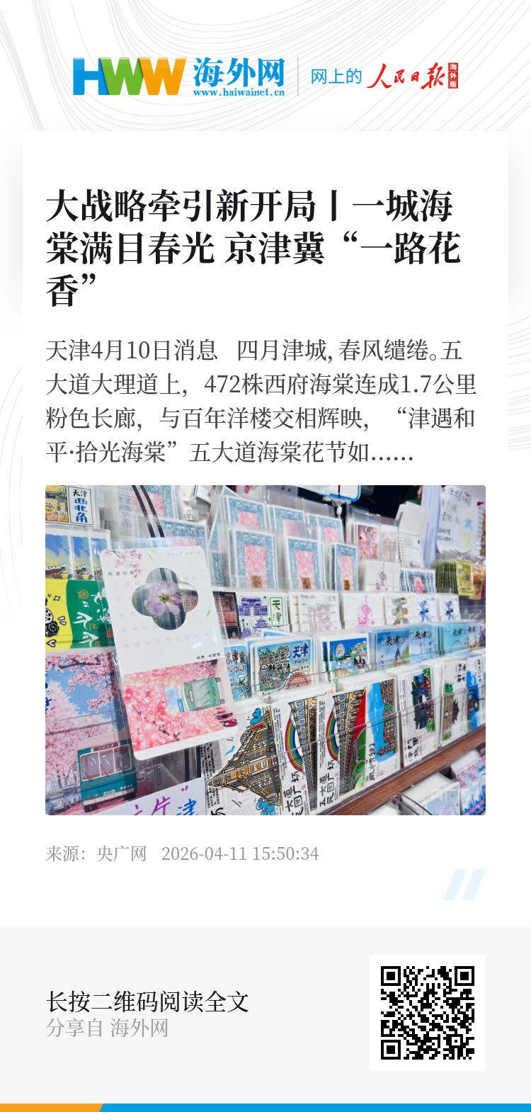 清明假期三天,天津市接待游客人次、游客总花费较2025年清明期间分别增长2.5%、4.8%,从文创小店到街头演出,从本地市民到京津冀游客,一朵海棠花激活城市“春日经济”,书写文旅商融合答卷。