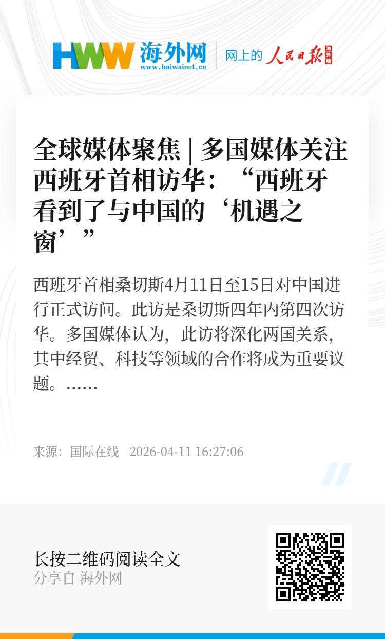西班牙首相桑切斯4月11日至15日对中国进行正式访问。此访是桑切斯四年内第四次访华。多国媒体认为,此访将深化两国关系,其中经贸、科技等领域的合作将成为重要议题。