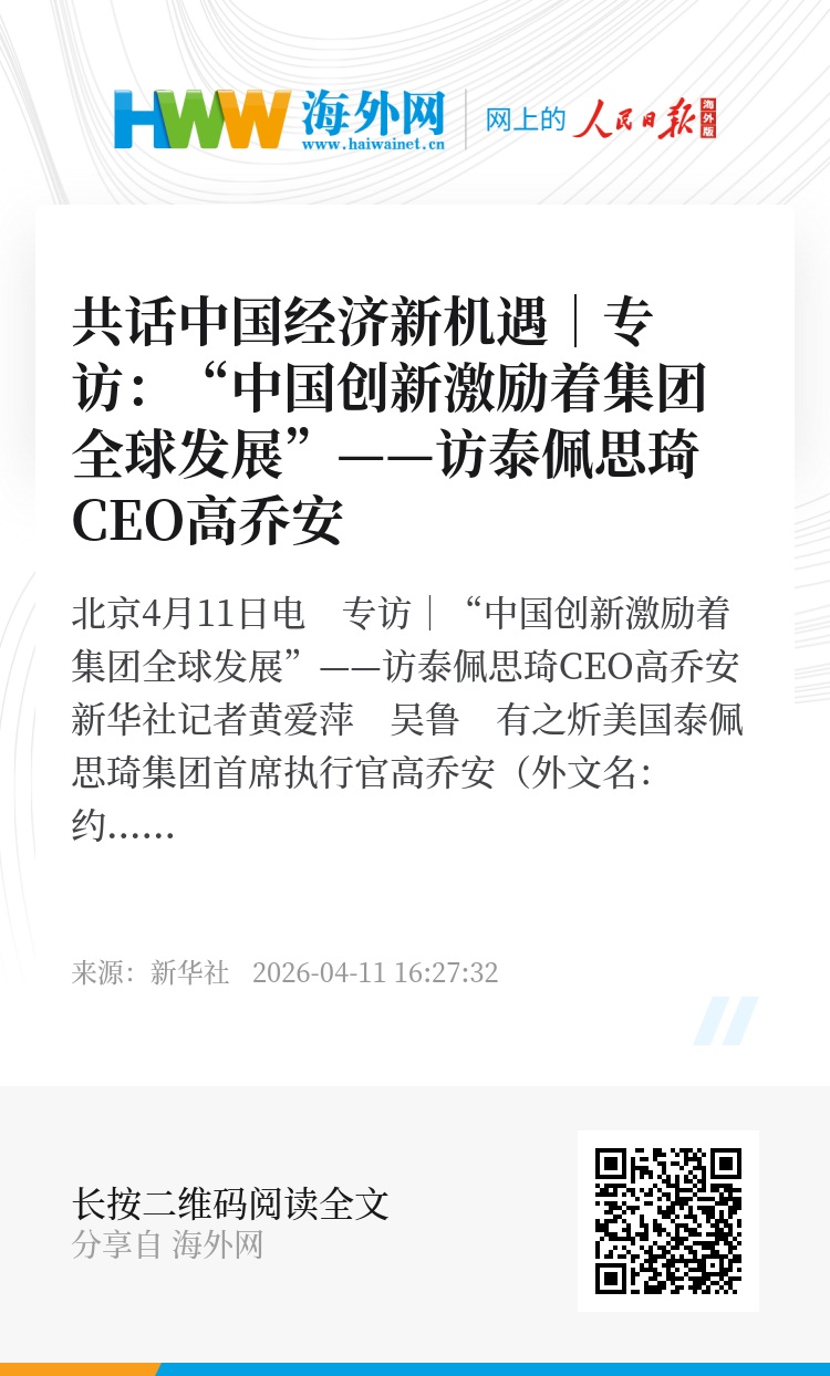 新华社北京4月11日电 专访|“中国创新激励着集团全球发展”——访泰佩思琦CEO高乔安