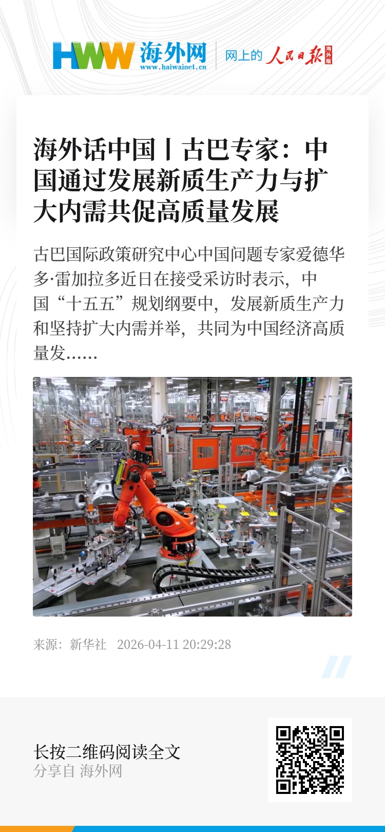 古巴国际政策研究中心中国问题专家爱德华多·雷加拉多近日在接受新华社采访时表示,中国“十五五”规划纲要中,发展新质生产力和坚持扩大内需并举,共同为中国经济高质量发展注入持久动力。