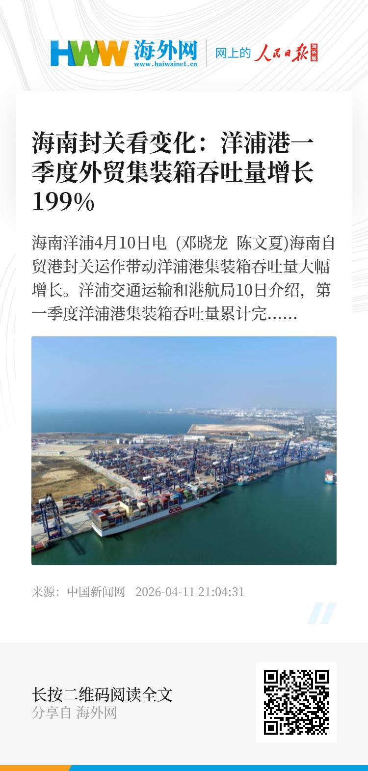 中新网海南洋浦4月10日电 (邓晓龙 陈文夏)海南自贸港封关运作带动洋浦港集装箱吞吐量大幅增长。洋浦交通运输和港航局10日介绍,第一季度洋浦港集装箱吞吐量累计完成98.37万标箱,同比增长94.37%;其中外贸集装箱吞吐量同比增长199%。